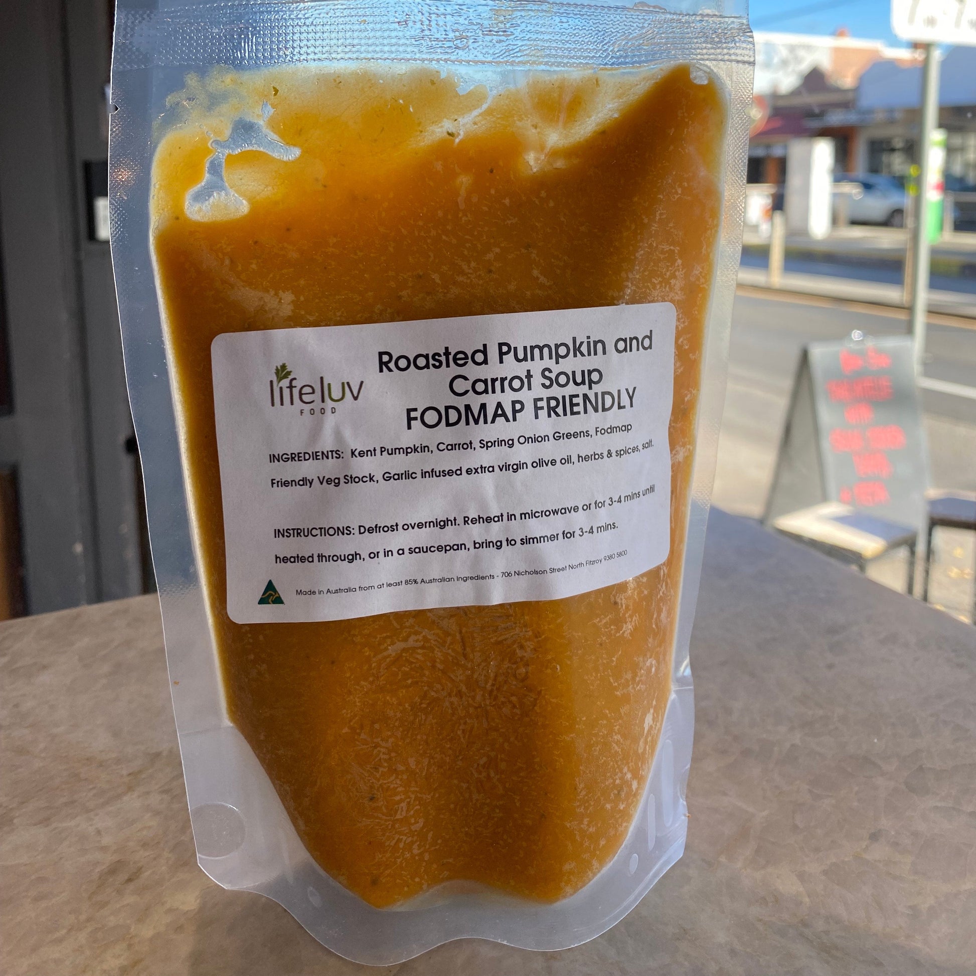 Kent pumpkin, Carrot, Spring Onion, Greens, FodMap friendly vegetable stock, Garlic infused extra virgin olive oil, Herbs & Spices.